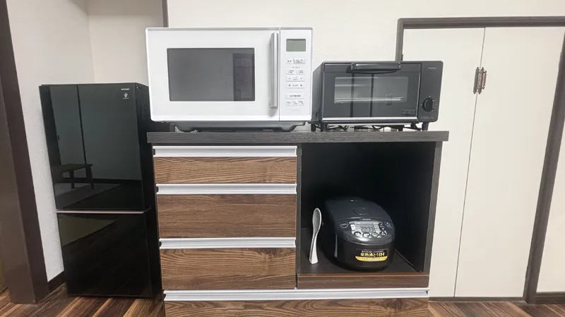 冷蔵庫、電子レンジ、炊飯器、電気ケトル、食器、カトラリー一式